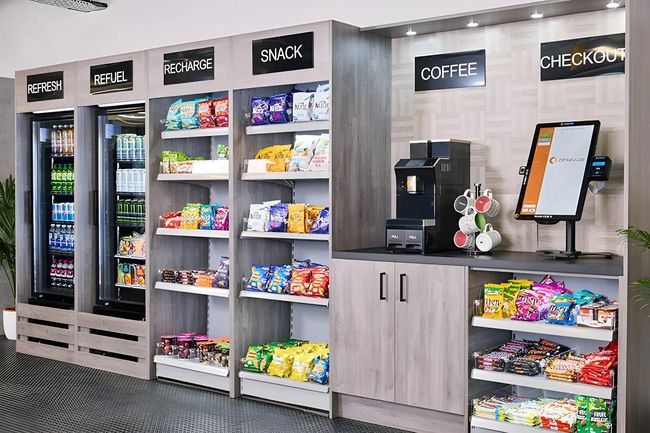 Upgrade your breakroom with a self-serve market stocked with fresh food, snacks, and beverages—available 24/7.
